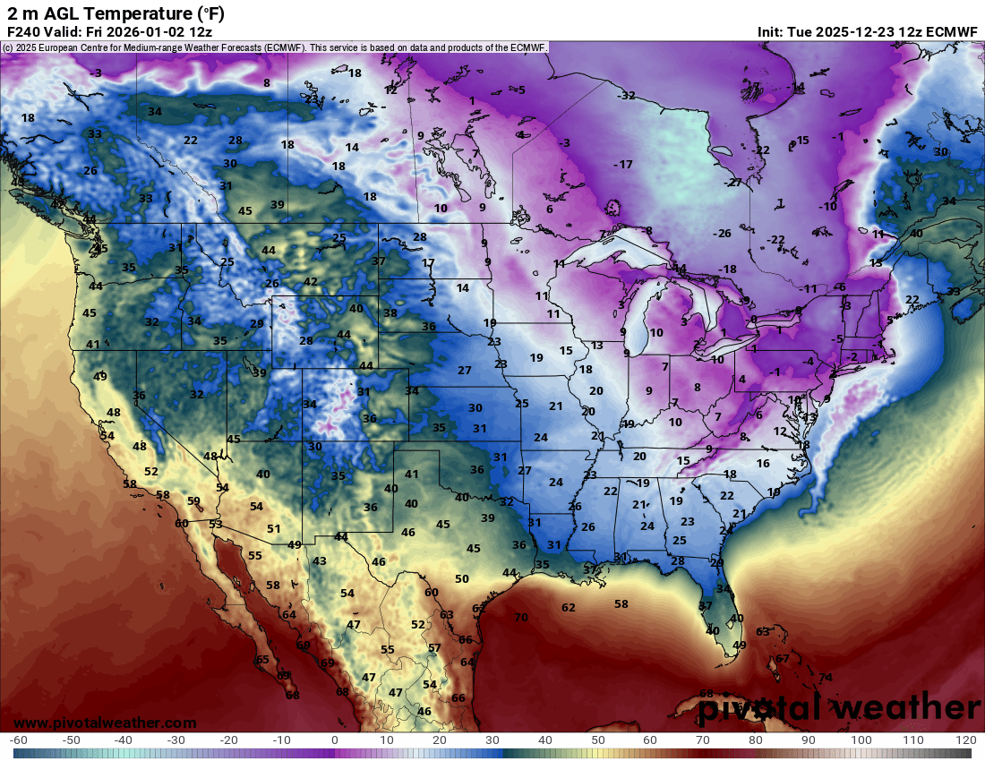 The 12z AIGFS(no idea how accurate that model is???) also sends a pretty strong cold shot around Jan 2-3. It is more Texas centered, but spreads eastward. It has an anafront - there is that word again. Models were overly strong w/ the early December cold. We have to guard against that, but this is January. Climatology favors colder air masses. -
