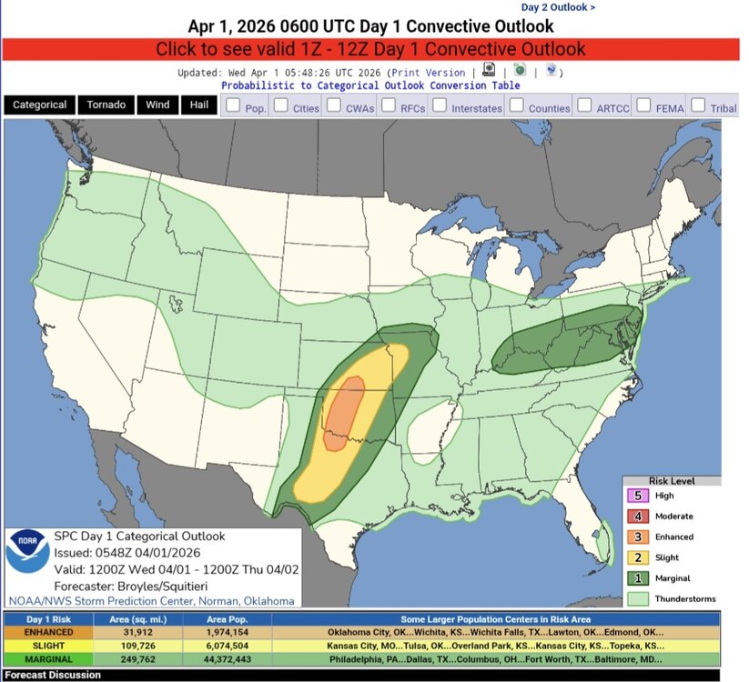 I only included discussion specifically regarding localized threats. The full discussion is in the link below. No science to it, just a roll of the dice and some twisted intuition. I sense a convactive over achiever coming on today. Not that it will translate to today, but cpa had some decently, elevated parameters that went the waste yesterday . The cap fully eroded over most of the area by mid-afternoon, but a lack of forcing and meager mid-level's hindered any convective development. Although simple details, I think frontal timing and orientation are conducive to localize overachievement, especially if the sun can get that surface baked for us cpa southernish. SPC AC 010548 Day 1 Convective Outlook NWS Storm Prediction Center Norman OK 1248 AM CDT Wed Apr 01 2026 Valid 011200Z - 021200Z ...Ohio Valley/Mid-Atlantic... West-southwesterly mid-level flow will be in place over much of the eastern U.S. today. At the surface, a quasi-stationary front will be located in the Ohio Valley from southern Indiana east-northeastward into far southern Pennsylvania. Surface dewpoints in the upper 50s and lower 60s F to the south of the front will contribute to weak instability by early afternoon. Increasing low-level convergence near the front and warming surface temperatures will result in scattered thunderstorms during the afternoon. Several short line segments are expected to form and move eastward across the Ohio Valley into the central Appalachians. 0-6 km shear in the 25 to 35 knot range and steep low-level lapse rates will support isolated severe storms with potential for damaging wind gusts. A low-end tornado threat will also be possible. https://www.spc.noaa.gov/products/outlook/day1otlk.html -
