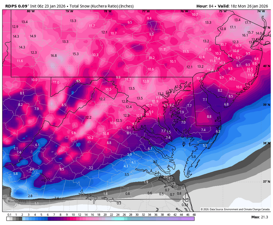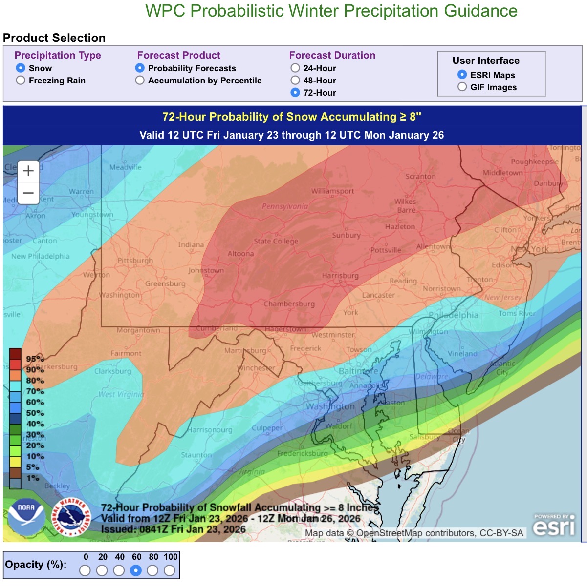 Updated percentage chance of hitting or exceeding 8” snowfall before flipping. For reference, DCA is at the 50% threshold.