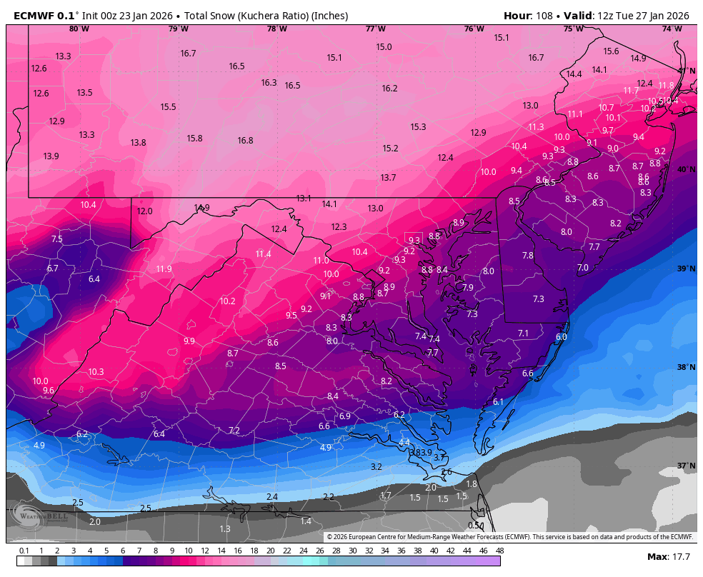 For dc Euro looks like about 0.8 qpf as snow, and then 0.6 qpf as sleet. 6-10 of snow and a thick layer of sleet, that’ll be a high impact event if it verifies. -