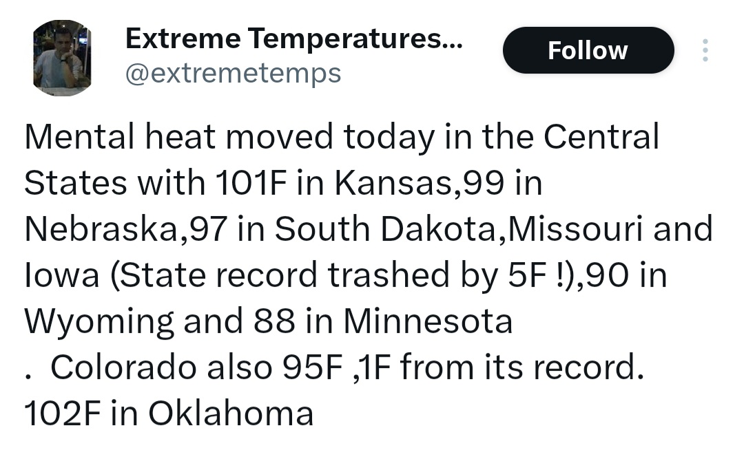In theme with the record shattering heat in the west-central US, I eye Flagstaff AZ to find they got to 29C/84F yesterday the 20th! The WUN avg shows 12C and the daily record of 21C...beat the record by 8C/18F+!?