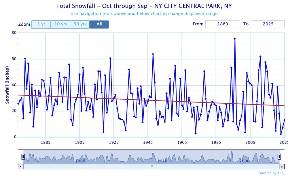 Pointing out identifiable shifts in the climate has nothing to do with doom. I use it to set the range of parameters for my forecasts. Warming temperatures and storm tracks over time mean less snow. The long term snowfall trend in NYC has been down as the winters have been warming. As the winters have been warming we reached a sweet spot for heavy snows between 1993-1994 and 2017-2018. The temperature snd storm tracks were just right along with the increased precipitation for heavy snows. But you will also notice during those years that we had very few average years which were common prior to the 1990s. It was an all or nothing snowfall pattern with great years over 30” and 40” with other years around 15” or under Past snow droughts were a function of drier winters which were cyclical. But warming is a long term trend due to increasing CO2 emissions. Plus we have experienced non-linear shifts which have abrupt and not gradual. So I have a few long range snowfall scenarios for NYC going forward. Scenario #1 is that the warmer storm track shift and less snow since 2019 is what we will have going forward with NYC shifting to under 20” of snowfall. A few seasons will reach average and above but most will be below the mid 20s. Scenario #2 is a bounce off the lows with more frequent snowy seasons but well below the 2010-2018 close to 40” average in NYC. This would be a short term pattern before the lower seasons begin dominating again. The lowest skill outlook would be a VEI-7 or 8 volcanic eruption which would induce a volcanic winter for 3-7 years with much colder and snowier conditions. Since these eruptions are no easily forecast and can have hundreds or thousands of years between events. So unless we get a historic volcanic event which isn’t easily to forecast, my guess is a a choice between scenario #1 and scenario #2.