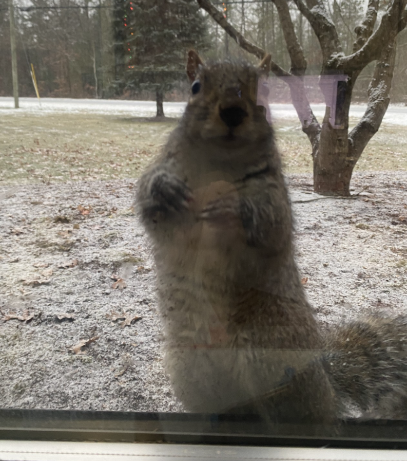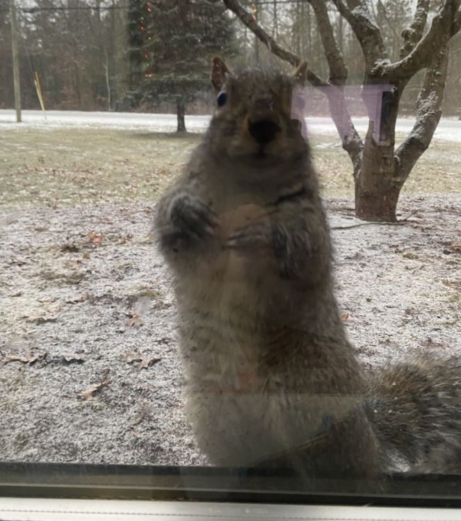 Just took a walk around the yard to throw some raw peanuts at the squirrels. Its been a rough year for them. I had no acorns in my yard this year and I have 50 year old monster oak in my front yard. Feed them at work as well. Below is fat Eddie just after our mini melt in January. He bangs on my glass now and then. It was actually pretty nice out. 12 to 14 inches of snow pack still and we topped out at 39. -