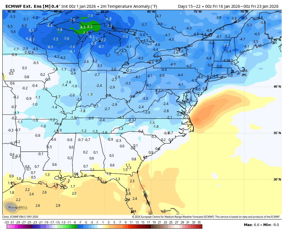 On this Happy New Year’s Day, I refuse to talk at all about the Bleaklies being almost the polar opposite of last year for the SE at this time. They’re not called “The Bleaklies” for nothing. So, what they’re showing shouldn’t surprise anyone. So, I won’t talk about them. They’re not bad at all though for the NE overall with NN averaged out per the in-house maps. I changed my mind. I’ll talk about one bleak: Jan 12-18 has gone from encouraging just 2 days ago To the commode today: