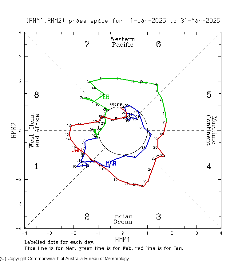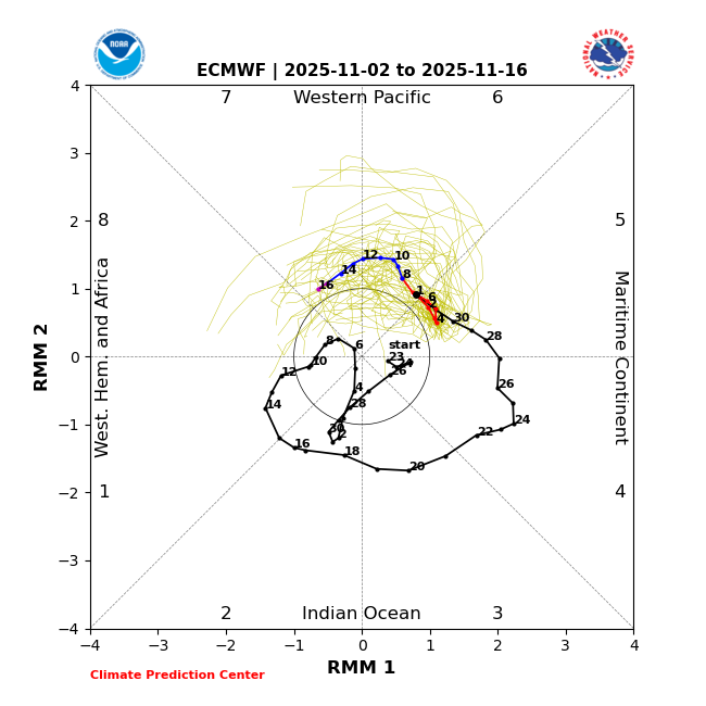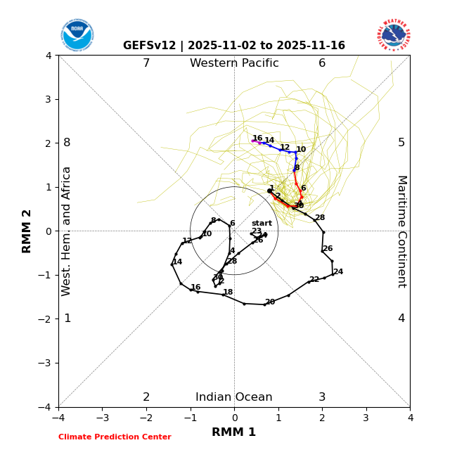 We’ll see. Latest MJO forecasts: 1. GEFS, which has been doing much better than EPS as is often the case in this part of the diagram: slowly headed to strong 6 in direction of strong 7 2. EPS: headed to moderate 7: