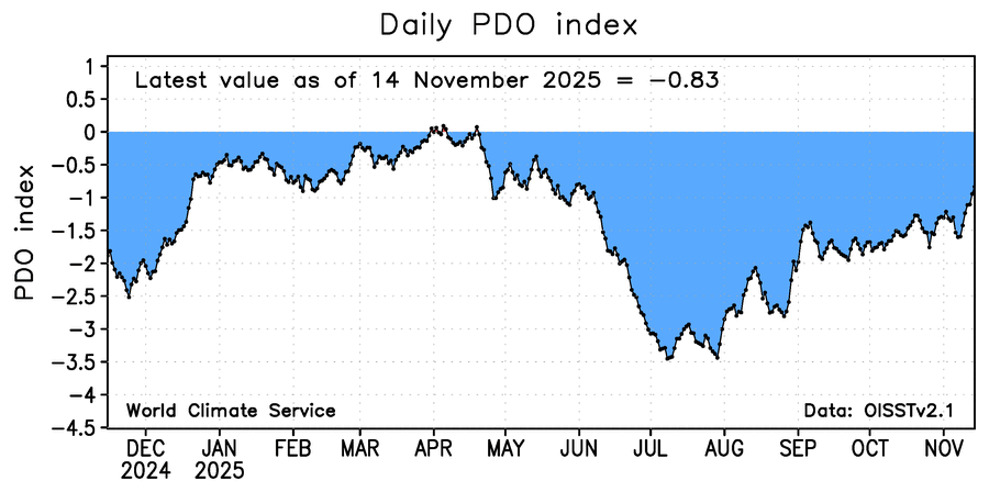 1. AAM is now dropping back from neutral and is forecasted to be in a solid -AAM (solid Ninaish) through the next 30 days per this CFS ens run: 2. WCS daily PDO has risen steeply the last 6 days and is up to -0.83, the highest daily since May: