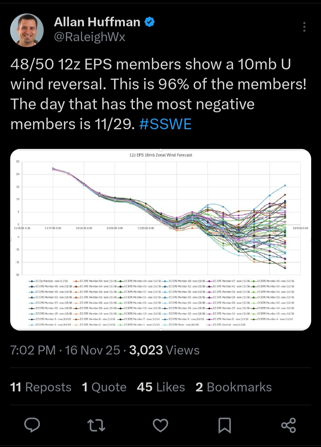 One notable thing today is a -NAO, albeit a weak one showing up at the end of all ensemble runs. It makes a difference for sure, even if its just -1 if its far enough west as far as flattening the SE ridge component