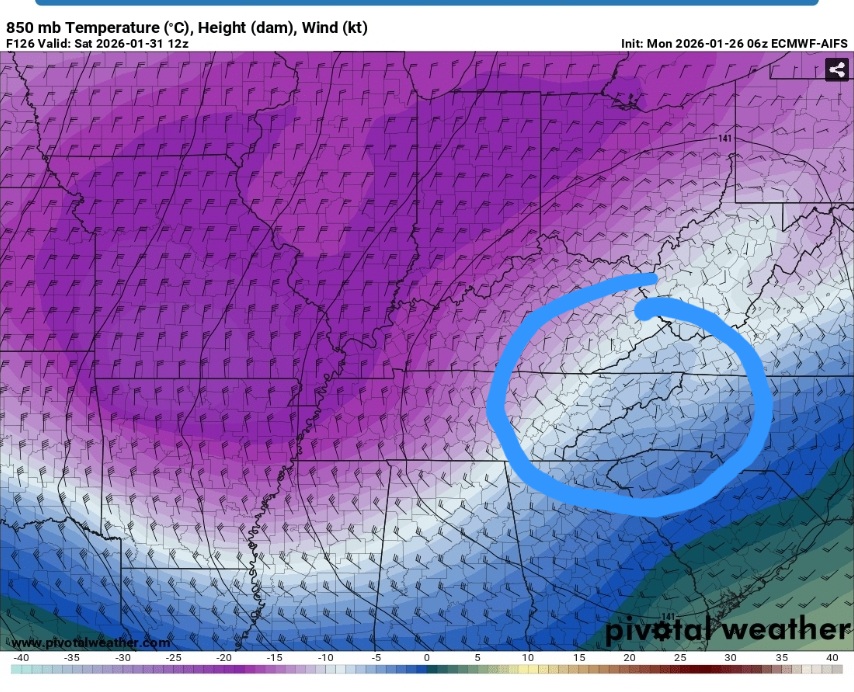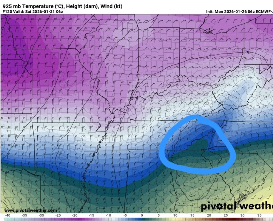 The setup reminds me of a couple of classic central and eastern Carolina snowstorms in the past. Maybe east TN can back into a decent snow? I'd say this one has high whiff potential, but the high end of what could happen is a high ratio super cold snow (which we rarely have any chance of seeing outside of northwest flow)