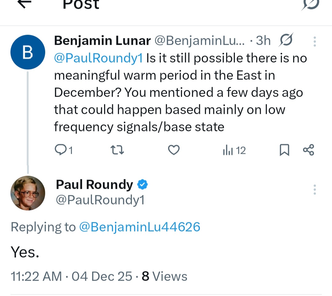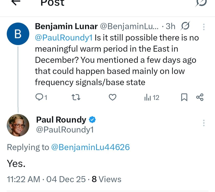 2. What I see from the 12z GEPS and EPS is very cold air in Canada that keeps pinwheeling into the US old school style. And that setup is a very stable pattern unlike other cold patterns we have seen. JB noted that wave lengths tend to shorten up during phase 8 and wx models will often struggle with details and strength of cold shots. If we kind of assumed this pattern began just after Thanksgiving, it makes sense for it to last to Christmas or just after, then Jan is likely warm, followed by another cold shot. This set-up reminds me a lot of 95-96 in terms of the overall sequence(maybe not the snow). Last winter did as we'll.