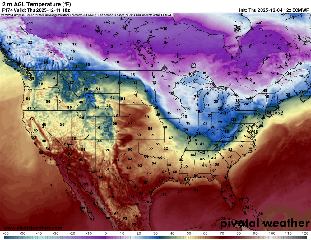 7. It's a very active pattern over the next couple weeks. There will be an alternating series of brief mild and cold surges. The Euro is showing quite a temp contrast a week from now between the plains and lakes.
