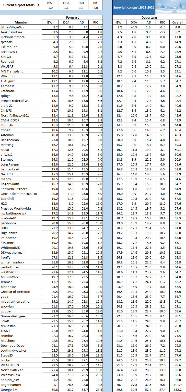 FYI, BWI snow has been upgraded to 1.0 inches and IAD snow has been upgraded to 1.3 inches. See below -- there is no relative change in the standings.