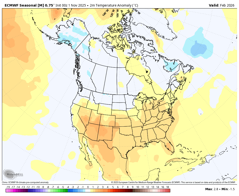 11. New Euro 2m by month shows a semi-front loaded winter though Jan is actually the coldest meaning it may be better described as a mid-loaded; this perhaps is largely related to the decent % of members having a major SSW in either late Nov or early Dec and the typical lagged E US cold well afterward for those members. That lagged cold would tend to be most concentrated in the first half of Jan. Thus, if that major SSW were to occur, I’d expect a colder Dec and especially Jan than what these are showing. If it doesn’t, I’d expect a warmer Dec and especially Jan vs this. **Climo is 1993-2016** Dec: similar to prior run Jan: much colder than prior run likely related to increased threat of early major SSW Feb: slightly warmer than prior run