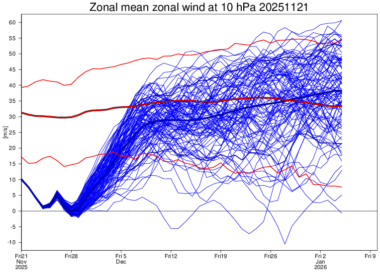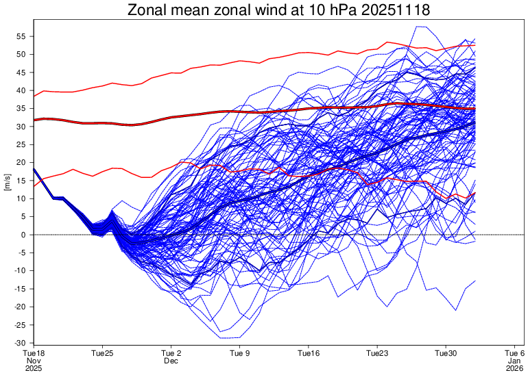 Today’s Euro Weeklies update on the SPV compared to last run keeps the reversal (or near reversal) but it’s a fair bit stronger Dec-early Jan. Keep in mind that the prior two runs were already significantly stronger for that period: Today’s EW mean zonal wind at 10 mb (11/21): significantly stronger than 11/18 run with, for example, 12/12 at +29 vs +11 on 11/18 run: EW run from just 3 days ago (11/18): 12/12 at only +11