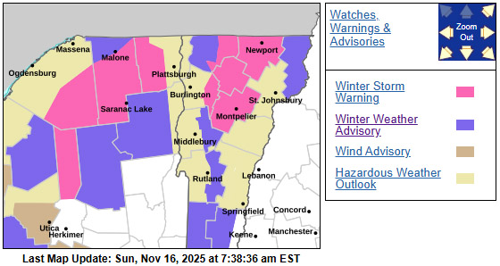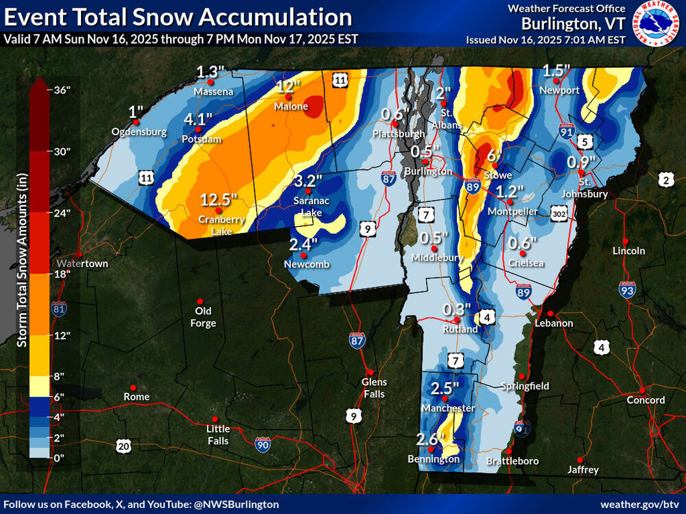 I guess folks weren’t kidding about the potential for some additional snow. We were under a Winter Weather Advisory for the front end of this system, but I woke up to find that we’re now under a Winter Storm Warning as the storm continues. Even in the valley here, the BTV NWS point forecast suggests the potential for 6-12”+. Current maps from the BTV NWS are below, and it looks like they reeled in those areas of darker red 24-30” shading in the updated version of the Event Total Snow Accumulation map, but there are still substantial areas of 18-24” shading.
