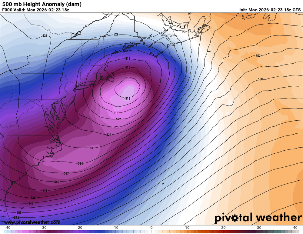 Talking about low track, this storm was a bit odd. It tracked just outside the benchmark, yet you look at the SNE snowfall plot (attached), things stand out. To have ptype issues or lacking big snowfalls on the Outer Cape, and yet heavy snow lacking once you get to the NH border and in the Berks, and monster totals "wedged" in-between, is atypical for a New England snowstorm. Typically, if the S+ does not make it into NH or Berks, there are *no* ptype issues in SNE or any issues are corrected quickly due to the ageostrophic flow/backing winds as the low wraps up well to the S and SE, so even the Outer Cape will do just fine, at least later in the winter season. Sure, PVD gets an all-time snowfall smashed, but BOS/ORH/CEF/BDL not even top 10, in fact, not even *close* for any of these cities? That's quite a disparity, probably the biggest one on record for a New England snowstorm. So in some ways, this was *not* a classic snowstorm for SNE or New England. The storm's big S+ area was rather confined and small N and NW of the low center, and the models overdid the big amounts in Berks and srn VT/NH until the last minute. I was confident 15-25" would make it into these areas, why not?, based on the track of the sfc low, that's what you'd expect! Do I sound pedantic? Well, the details count here, as they do in all sciences. Subtle differences not so obvious can and are *huge* as to sensible wx for an event. I go back to my previous (long) post on this thread, "one size does not fit all" and thus you can't gloss over any event calling it "perfect" or "classic" or "what it should be." That's not how the wx, climate, and atmosphere work. One explanation I think for the odd snowfall pattern/gradient is the cut-off 500 low stayed well offshore. For the best expansive comma head S+, you want sfc low right near the benchmark, but the 500 low to pass right over or very close to the BOS-ORH-BDL-PVD zone. You get the biggest height falls and max dynamic cooling aloft, so "part 2" of the storm (no mdt-hvy snow break though) is solid fluffier, more convectively-driven snow. In this case, the 500 low as it passed SNE was almost co-located w/ the sfc low. That's not common for a classic blockbuster for New England. Why was that? Well, no blocking over NAMR for one. In fact, deep 500 low near Greenland! Second, no polar jet at all. Just one big solid jet across the cntrl/srn CONUS. Hard pressed to call it a STJ though! And remember, some posts I saw elsewhere on this, the CONUS pattern 2 before the storm, it was pointed out, "does this look like a 500 flow over the CONUS and a blizzard on the E Coast 2 days later??? (attached is the 2/20 12z 500 analysis). Where is your cold confluence over the NEUS? No Hudson Bay vortex! See what I mean, non-standard not just in the smaller-scale for the event itself, but the larger-scale across NAMR!!! Third, the 500 low itself, going by its last closed contour, was rather small. Look at 18z 2/23 GFS 500 analysis below. The last closed contour extended only from central ME to about RIC's latitude. Also, the elongated of the trough as a whole to the SW?, again, not something you see typical for a KU! Comments? -