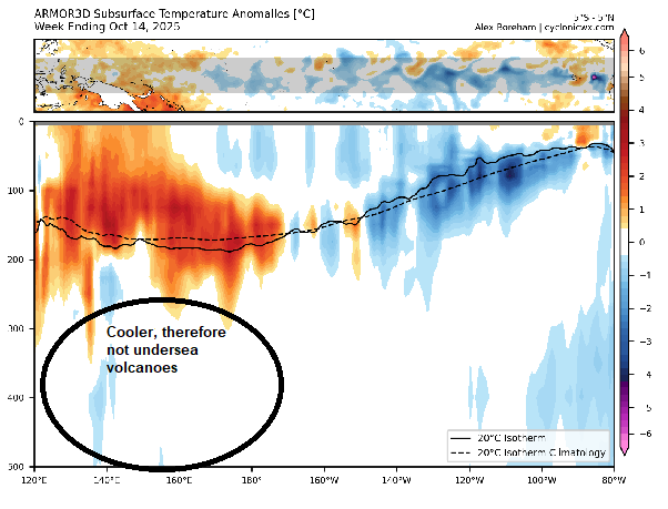 More social media disinformation: The reality: Source of subsurface anomalies: CyclonicWx.com. I circled the depths and added the label to show what is occurring. were volcanoes responsible, SSTAs would be increasing at depth. -