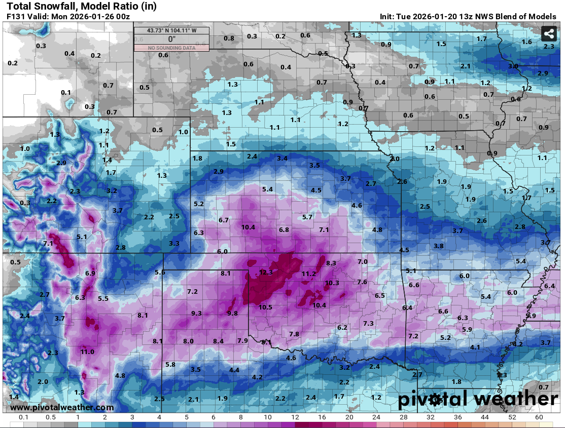 Here is the most recent run of NWS Blend of Models through Sunday evening. I haven't done a ton of research on it, but essentially it combines multiple numerical weather models and post processed data in hopes of giving an accurate and reliable starting point for NWS forecasts. I will say this most recent run is the most bullish with amounts across the board so far. Previous runs had ICT in the 3-5" range. This is probably due to a few factors. Models becoming more aligned as we go (confidence) and/or trends in the models. I'd still expect some fluctuations as we progress through the week, but I'd expect them to become smaller by the day. I'll be curious how this does as I don't have much history with it. -