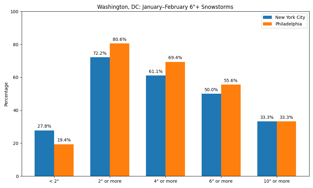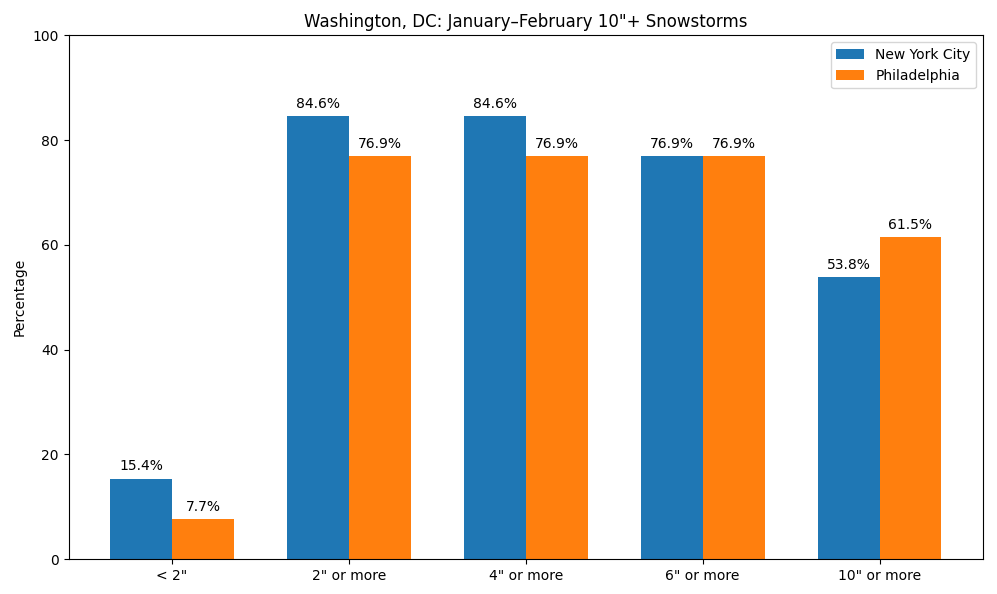 At present, it appears very likely that Washington, DC will see 6" or above snowfall during the January 24-26, 2026 snowstorm. Since 1950, below is the distribution of outcomes based on 6" or above and 10" or above January-February snowstorms in Washington, DC for New York City and Philadelphia. In theory, guidance with the higher-skill initialization (4dVAR)/better resolution (ECMWF, GGEM, and UKMET) should have a better handle at the current lead time. One can't fully dismiss the GFS, especially as there are ensemble members that support its solution. However, if one also weighs the historical outcomes while waiting for the guidance to reach higher skill levels in resolving the synoptic details (usually within 3 days of the event), it seems plausible that New York City and Philadelphia are plausibly in line for at least a 3"-6" snowfall with upside potential if full phasing takes place and the storm tracks closer to the coast. -