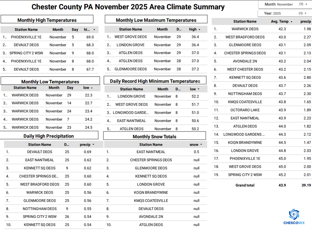 Below is the November Climate Summary for Chester County PA. With our average temperature of 43.8 degrees, we were just a little below Average 44.0. As you would suspect this was the 67th chilliest November out of 133 years. Our coldest November on record was the 37.5-degree average back in 1977. The warmest November on record was way back in 1931 at 50.8 degrees. We averaged across the area 2.06" of rain which is about 1.30" below normal. Our wettest November was in 2018 when we averaged 8.22" of rain. Snowfall was 0.5" with is 0.5" below normal for the month. Our snowiest on average November was back in 1938 when we averaged 10" of snow. -