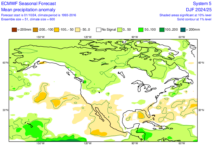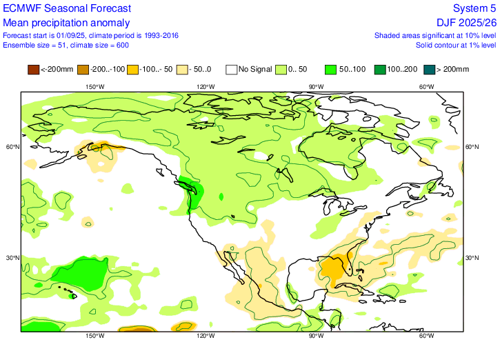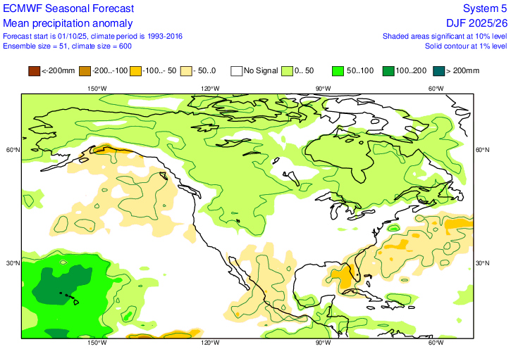 New (Oct) Euro precip anomaly forecast for DJF: very slightly wetter in NE/SE and very slightly drier part of Midwest vs Sept outlook and similar to Oct ‘24 outlook for last winter/La Ninaish NN much of E US but BN signal deep SE with lack of dominant ST jet Sept ‘25 outlook for DJF: Last Oct precip for last winter: