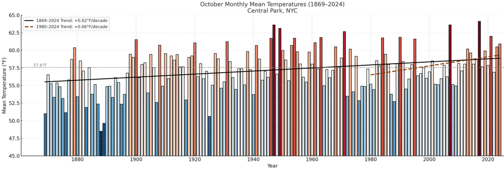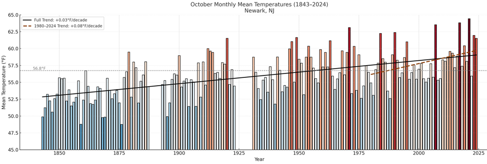Here's how October has fared in New York City and Newark. The rate of warming has been very gradual, though there has been some acceleration since 1980. The chart's anomalies are based on the 20th century mean temperature for October. For Central Park, the 1991-2020 baseline temperature is 57.9° vs. the 20th century figure of 57.6°. Note: Octobers with large amounts of missing data were excluded.