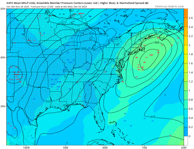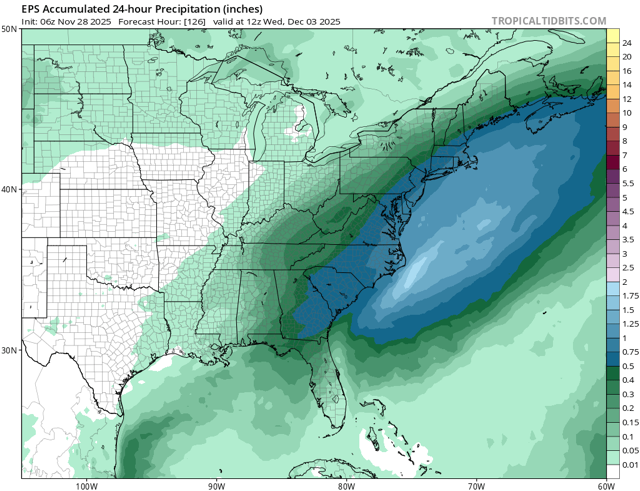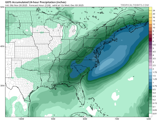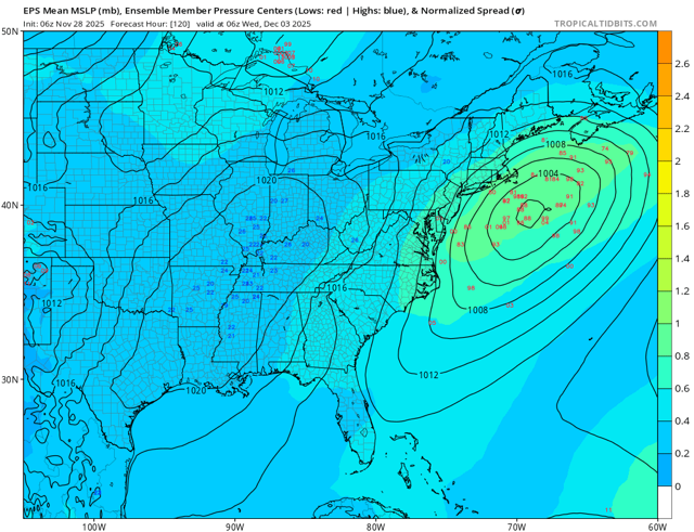 So we’re 4-5 days out from our first winter storm of the season. Models are pretty consistent in bringing surface low off coast and traversing across the area. Prior to storm we have a cold front that pushes through proving antecedent airmass. This cold unfortunately won’t be locked in place. High pressure while initially in a pretty good spot just north of the area will be retreating allowing warmer air to intrude. Overall a pretty classic storm setup. With storm being so early in the season, areas inland and with elevation will be more favorable for staying on the snowier side while coastal areas will see perhaps an initial burst of snow but transitioning to rain as warmer air intrudes. The storm is pretty juiced up so we could see some seeing 6-10” snow out of this and those on the wet side seeing 0.5-1.0” of rain. Below are the latest 06z EPS and GEFS ensembles showing tracks and 24hr mean QPF.