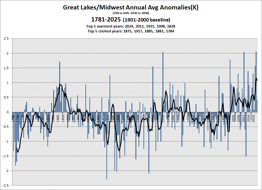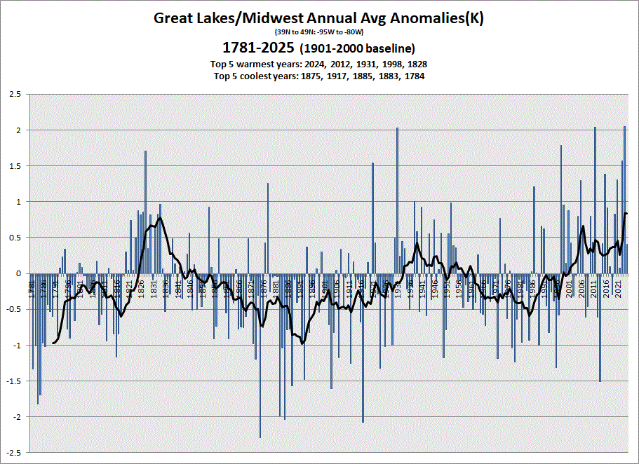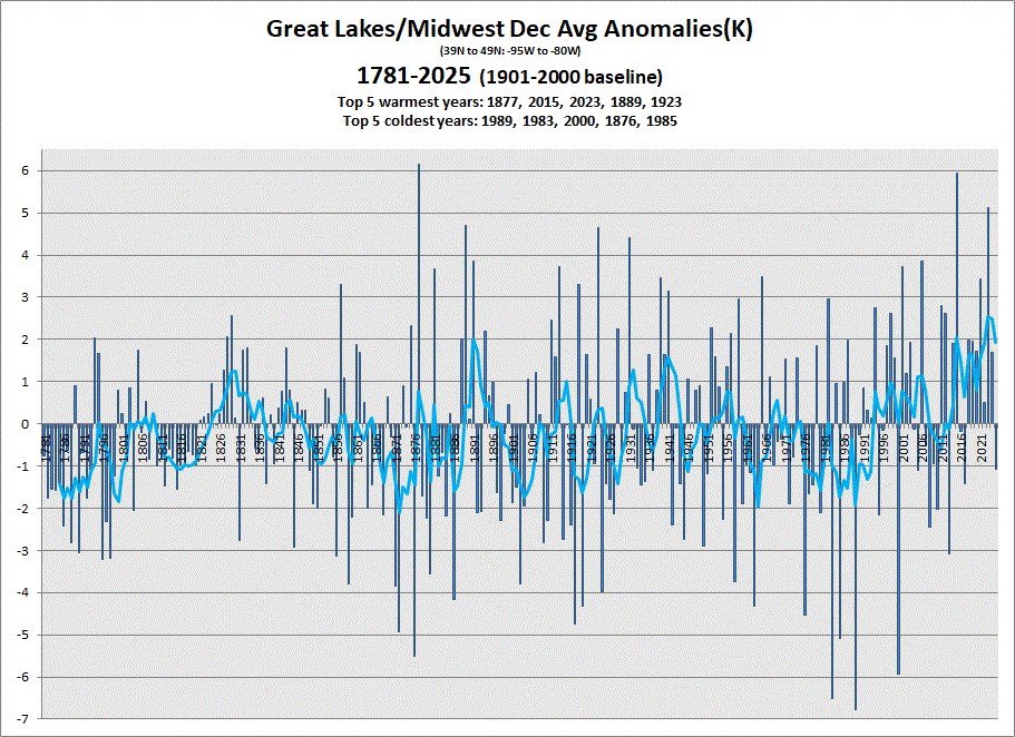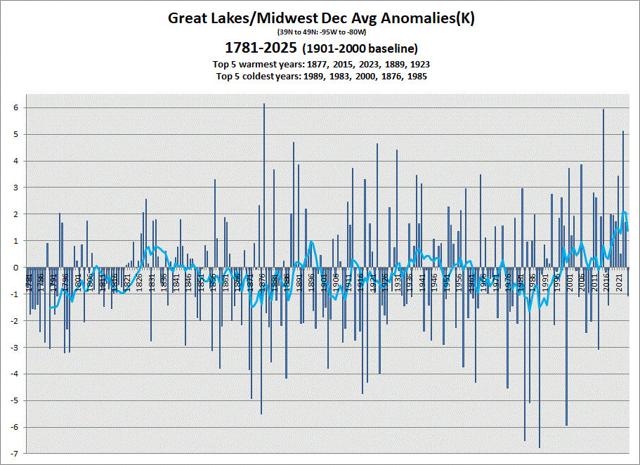 Early data in for Dec. Little cooler this year akin to 2017. Annual is on the warmer side, but less so than the last 2 years. 5 & 10 yr tend charts shown respectively. BTW, have more data back to 1781. Just a reminder, pre-1850 is slim on data, so take it with a grain of salt. Trends are probably close, but individual years may be changed a lot when more data becomes available in the coming years (hopefully).