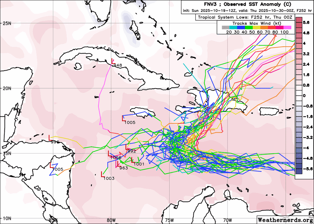 Notable left trend on FNV3 (Google DeepMind ensemble) from 12z run yesterday to today's 6z run - both in terms of the the members that show a sharp NE curve into Hispaniola being further west (Haiti vs. DR) and a lot more members turning west into the NW Caribbean