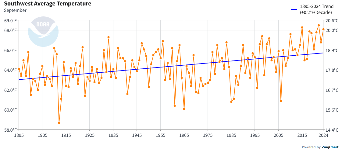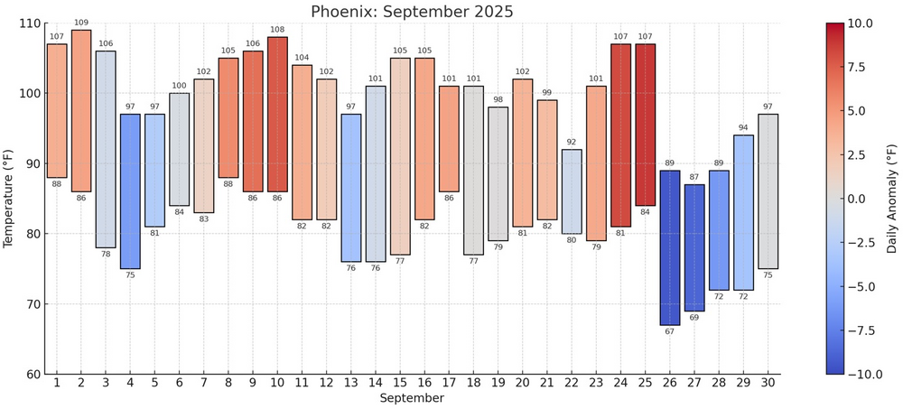 September 2025 in Phoenix marked the fourth consecutive year with a monthly mean temperature at or above 90°, a milestone never before observed in Phoenix's historical climate record which goes back to 1895. This persistent late-summer heat is consistent with the broader impacts of climate change, which is driving rising temperatures, more frequent and intense heatwaves, and shifts in seasonal patterns across the Southwest. Although internal variability influences any single month's weather, the sustained nature of recent September heat underscores a long-term warming trend fueled by anthropogenic greenhouse gas emissions. September also saw an hourly rainfall record set on September 26th. During a severe thunderstorm with large hail and gusts of 56 mph, Phoenix received an hourly rainfall amount of 1.09". Even as the Southwest is undergoing aridification, an increasingly intense hydrological cycle driven by ongoing warming can produce intense rainfall amounts. -