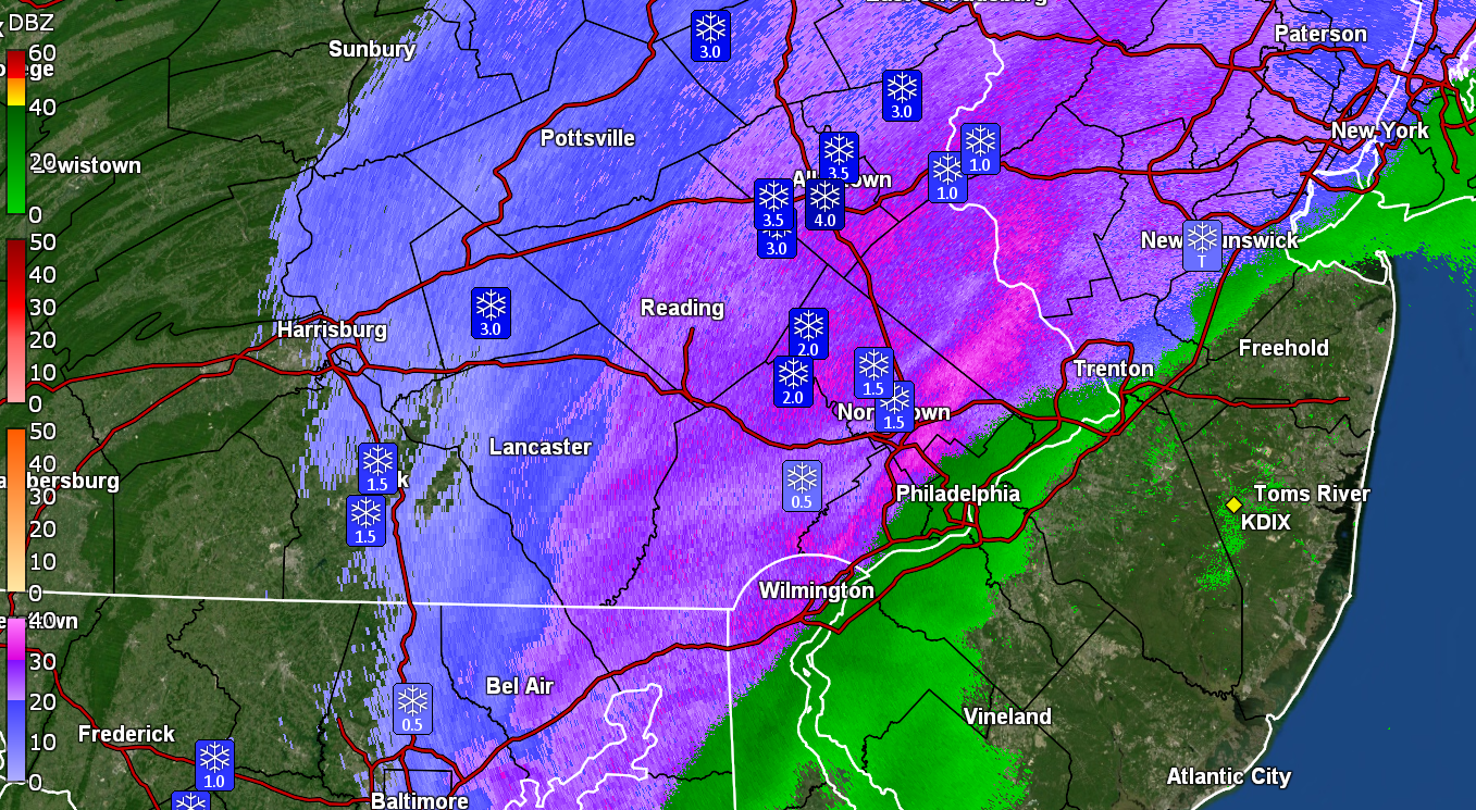 Temps in Philly are a little too warm for much stickage. Looks like all frozen precip but it’s melting faster than it can accumulate for the most part. Hope we can get a couple inches tomorrow