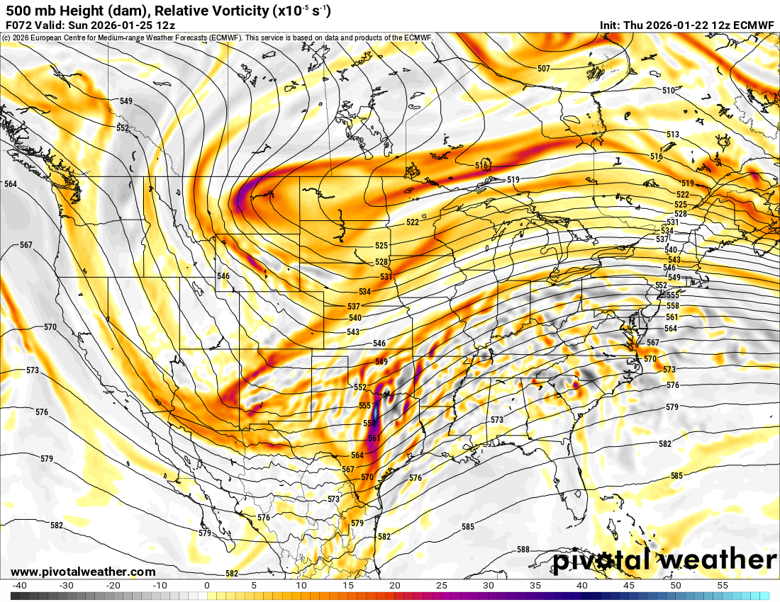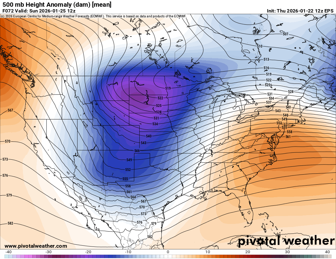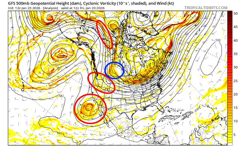 I think NE OH is in a good spot for this one...the heaviest QPF axis will remain a bit to our south, but soundings suggest ratios should be around 15:1 for most of the day Sunday (and likely climbing higher in any lingering lake enhanced snow by early Monday). There have been slight bumps SE in my eyes in both the 0z and 12z runs today, but we're still solidly inside the swath of heavier snow. Overall, I don't expect much more than small fluctuations/trends from here on in with this storm but I'll try to look at what could change. There are some sensitivities to both how well the storm phases to our southwest and how much the PV over the Upper Midwest/Great Lakes is trying to press in. A better phase would argue for a further northwest track, but northwest trends have been stunted for the last several runs now due to the PV to the north not lifting out much as the storm deepens and tracks NE Saturday night into Sunday. This is the European ensemble mean 500mb heights for the last several runs valid at 12z Sunday. There still are subtle run-to-run adjustments both with the exact placement of the PV and with how well-phased the trough ejecting into the Plains is...to me, the there haven't been substantial trends either way with the PV while the trough has trended perhaps a bit less phased overall. That has resulted in what I think has been a small SE bump in these recent runs. Heights are still rising plenty ahead of the storm and there may be room for a subtle trend back northwest if we see a better phase, but unless we see trends towards the PV lifting out quicker I don't think it makes a huge difference. This is just the 500mb height and vorticity trends from the operational Euro...there are not clear trends towards a more or less phased solution overall, though there may be a slight trend for the trough to eject into the Plains slower, which in theory could give the PV a little more of a chance to press in ahead of it. The red circles are the main pieces of energy phasing together with this storm...the Baja low and shortwave diving into Canada have not been fully sampled yet, but will becoming increasingly sampled in the next sets of 0z/12z runs. There may be some opportunity for trends regarding how well the storm phases over those next cycles, though my guess is there won't be a significant trend either way. The shortwave circled in blue isn't really phasing into this, but will help dictate how much the PV presses into the upper Midwest/Great Lakes north of the storm. My guess is we won't see a notable trend with the PV from here on out, though I've been surprised before. Overall, guidance has bumped SE a bit in recent runs but the overall change hasn't been much for NE OH, as we are pretty solidly inside the swath of heavier snow. There will be some snow from late Saturday night through Monday morning in NE OH, a long duration, with the heaviest occurring late Sunday morning through early Sunday evening as it looks now. Despite the icy lake, there will probably be some form of enhancement amid lingering light synoptic snow through at least Monday morning as the storm pulls away. My guess is rates will generally be modest, but a few hours of rates pushing an inch per hour on Sunday seem feasible. My guess on snow for most of NE OH would be in the 7-13" range...only sticking 7" in there in case the PV presses in a bit more and we see another small bump or two SE, though if you take guidance as it is now we'll pretty solid for like 9-12". It does get iffier for Toledo, they currently look solid for something like 5-8" but are a bump SE away from seeing that decrease some more.