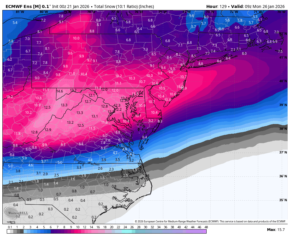 Not sure if folks will find this useful, but I post this model summary info in a few other places (FB/non-weather forums/my email list) and folks seem to like it, as it provides a decent summary without posting 14 maps, so thought I'd see what people thought. These are model summaries from 0Z for CNJ and the immediate PA counties bordering CNJ, i.e., areas between 276/195 and 78, as well as for NENJ (eastern Union/Essex and Hudson) along 95 and NYC. I also include the estimated snowfall amounts at both 10:1 and 15:1, which is my guess for ratios we'll see (I know some think we'll see higher, but I'm not ready to go there yet), plus I included the same info from the 12Z runs of these models. GFSAI isn't included as I don't have direct snow info for that model (but we know it's no longer an outlier based on QPF). As an aside, I've never seen model consensus like this 4.5 days out (or maybe even 4.5 hours out, lol. Comments welcome. The Euro shows 10-12" at a 10:1 ratio and 15-18" at a 15:1 ratio and the 12Z run was 7-10". The Euro AIFS shows 8-11" at a 10:1 ratio and 12-16" at a 15:1 ratio and the 12Z run was 5-8." The GFS shows 8-11" at a 10:1 ratio and 12-16" at a 15:1 ratio and the 12Z run showed nada for CNJ. The CMC shows 10-13" at a 10:1 ratio and 15-20" at a 15:1 ratio and the 12Z run was 7-11". The UK shows 10-13" at a 10:1 ratio and 15-20" at a 15:1 ratio and the 12Z run was 9-12". The ICON shows 8-10" at a 10:1 ratio and 12-15" at a 15:1 ratio and the 12Z run was also 8-10". The NBM (model blend) shows 11-14" at a 10:1 ratio and 16-21" at 15:1 ratios and the 12Z run was 8-12". -