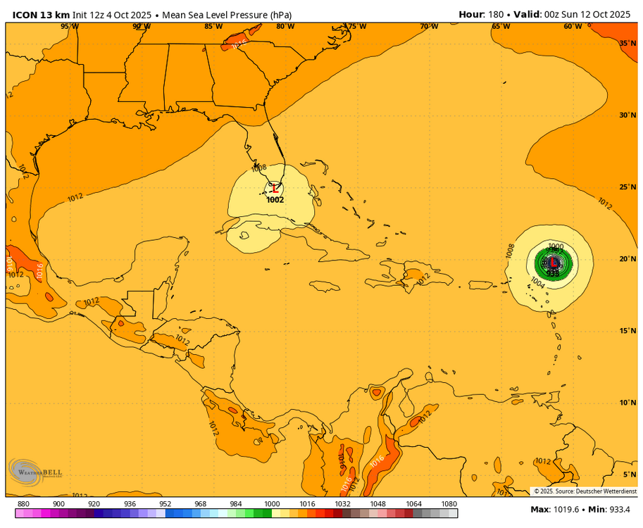 Pumpkin: 12Z UKMET dropped the FL TC but still has this though it doesn’t form til 162, moving WNW to the SSW of Bermuda: NEW TROPICAL CYCLONE FORECAST TO DEVELOP AFTER 162 HOURS FORECAST POSITION AT T+162 : 22.7N 67.7W LEAD CENTRAL MAXIMUM WIND VERIFYING TIME TIME POSITION PRESSURE (MB) SPEED (KNOTS) -------------- ---- -------- ------------- ------------- 1200UTC 11.10.2025 168 23.0N 68.5W 1009 24 ——————- 12Z Icon 933 mb at 180 but getting ready to recurve; SE US being partially protected by TS S FL from the lemon though would very likely recurve safely even without that since overall pattern shouldn't allow it to get close: