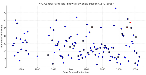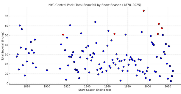 He was referring to New York City (Central Park). Interior sections are cooler than NYC's heat island. For example, using the two seasons you cited, the winter mean temperatures were as follows at nearby SMQ: 2017-18: 31.7° and 2020-21: 32.6°. For Central Park, the winter mean temperatures were 36.1° for both winters. Here's how 50" seasons disappear in New York City's historic climate record: Mean Winter Temperature above 32° (qualifying 50" or above seasons are denoted in red): Mean Winter Temperature above 33° (qualifying 50" or above seasons are denoted in red): Mean Winter Temperature above 34° (qualifying 50" or above seasons are denoted in red): New York City (JFK, LaGuardia, and Central Park) has never had a 50" season with a mean winter temperature above 35.0°. In the broader Mid-Atlantic, Washington, DC has a single case at 35.8°, so under the right circumstances, the upper-bound is higher than what New York City's climate record shows. On the issue of a VEI-7 eruption, it would lead to short-lived but rapid global cooling (perhaps several tenths of a degree C). Mid-latitudes would generally see appreciable cooling. Internal variability can still result in sufficiently cold winters, but the kind of cold typically associated with 50" or above snowfall seasons in New York City is decreasing in frequency. Even last winter was at the outer fringes of temperatures consistent with such snowfall in New York City's climate record. Interior sections away from the coast and outside the major heat islands of the big cities remain sufficiently cool for more frequent 50" or above seasons, and they will remain that way for several more decades at a minimum. However,@bluewavewas addressing New York City. He wasn't making an argument outside of New York City. -