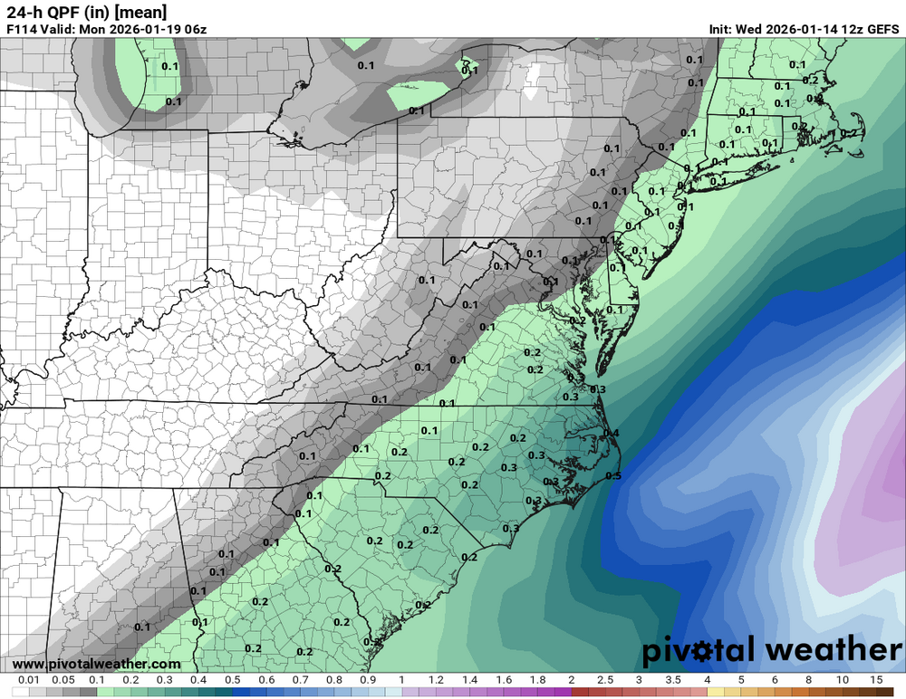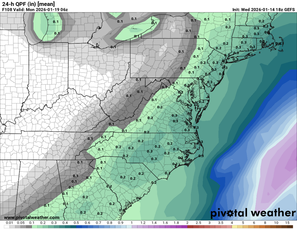 GEFS is northwest of 12z and wetter: (DCA went from 1.2" mean to 2.3") There are also some members more amped than the op: