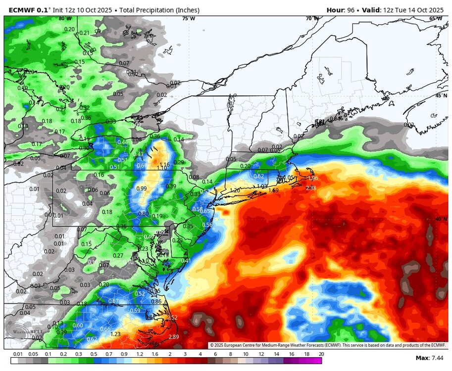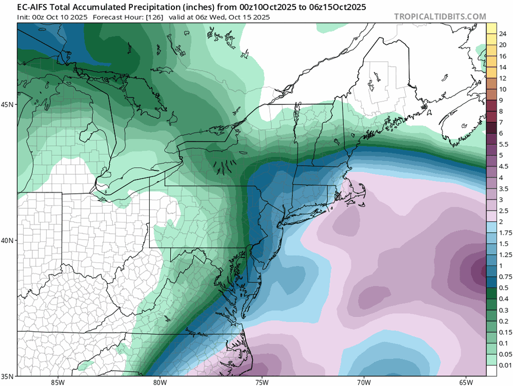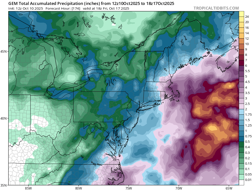 "Potentially" powerful Nor'easter Sun-Mon 10/12-13/25 with needed rain-especially south of I84, and fairly high impact sct coastal gusts 50+ MPH and possibly moderate or greater coastal flooding at the midday Sun and Monday high tide cycles.