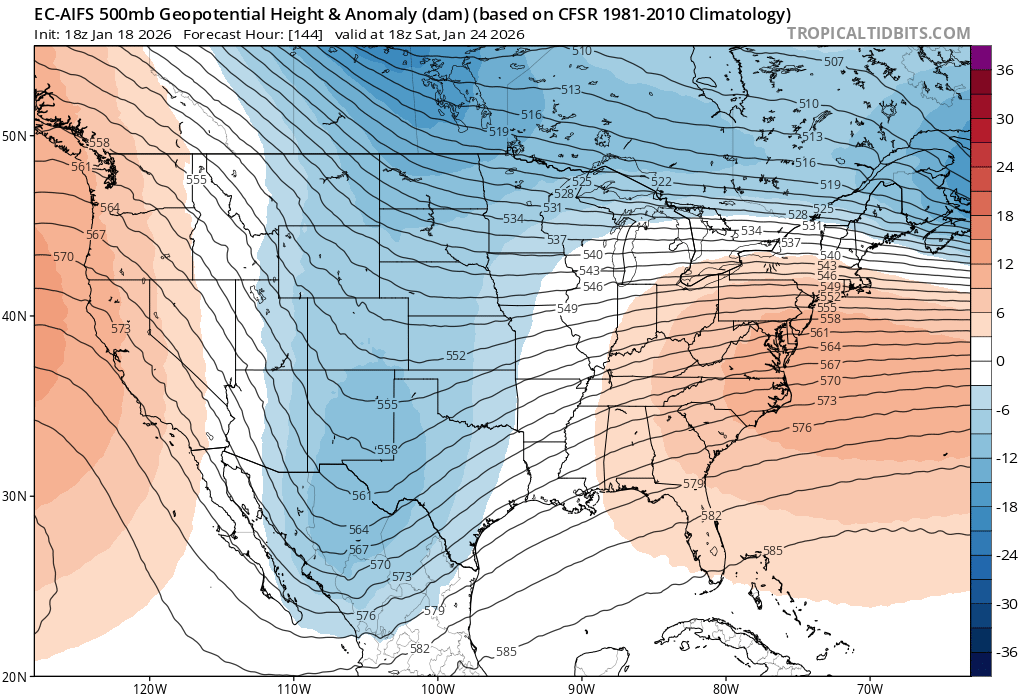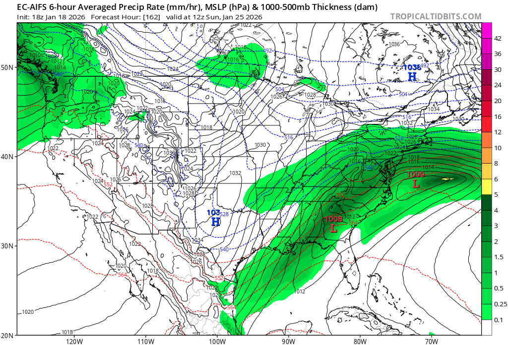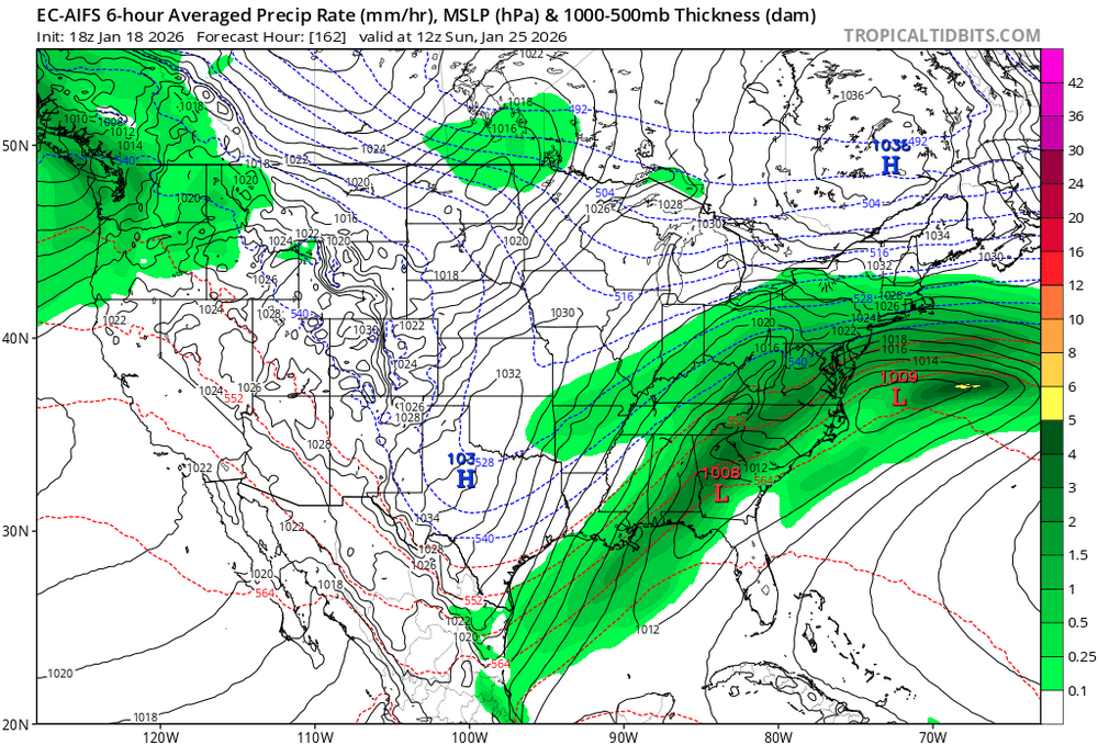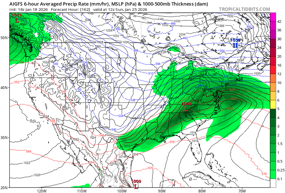 Op GFS is the only model driving a 1050 high down into the center of the country. Both AI models look very similar with the strength and position of the HP. Which is nearly perfect for us. I am thinking the GFS is wrong. But who knows a week out.