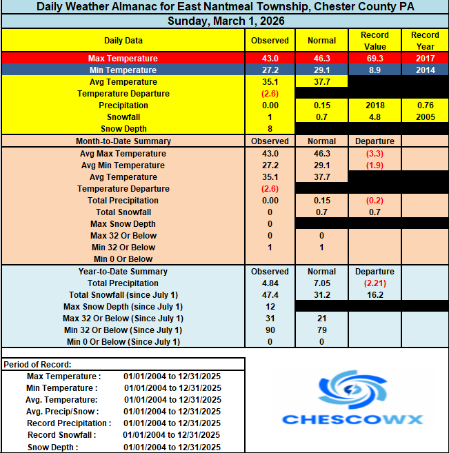 We will see well below average temperatures both today and tomorrow before we see about a 10-day period of well above normal temperatures. We turn colder again around the 13th of March. Some southern areas could see some light snow developing this afternoon with snow spreading northbound across the rest of the area after 1am. Expect to see some Winter Weather Advisories issued later for many areas N and W of Philly. Any snow will change to freezing rain and then all rain by no later than about 10am on Tuesday. It could be a slippery commute in spots. For the rest of the week, we warm to well above normal temperatures with solid changes of needed rain for most days with the exception of Friday. -