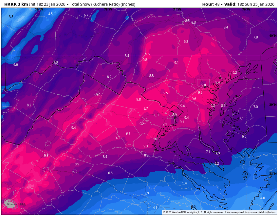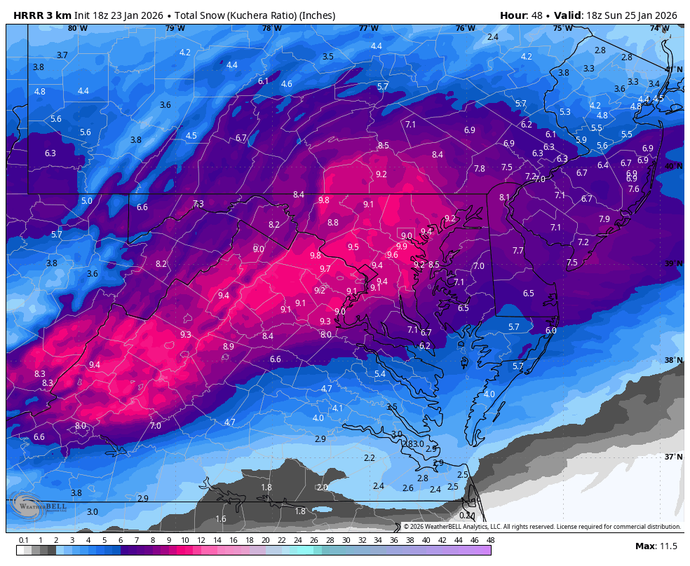 18z HRRR at the end of its run at 1pm on Sunday, with roughly 7-9" on the ground. -
