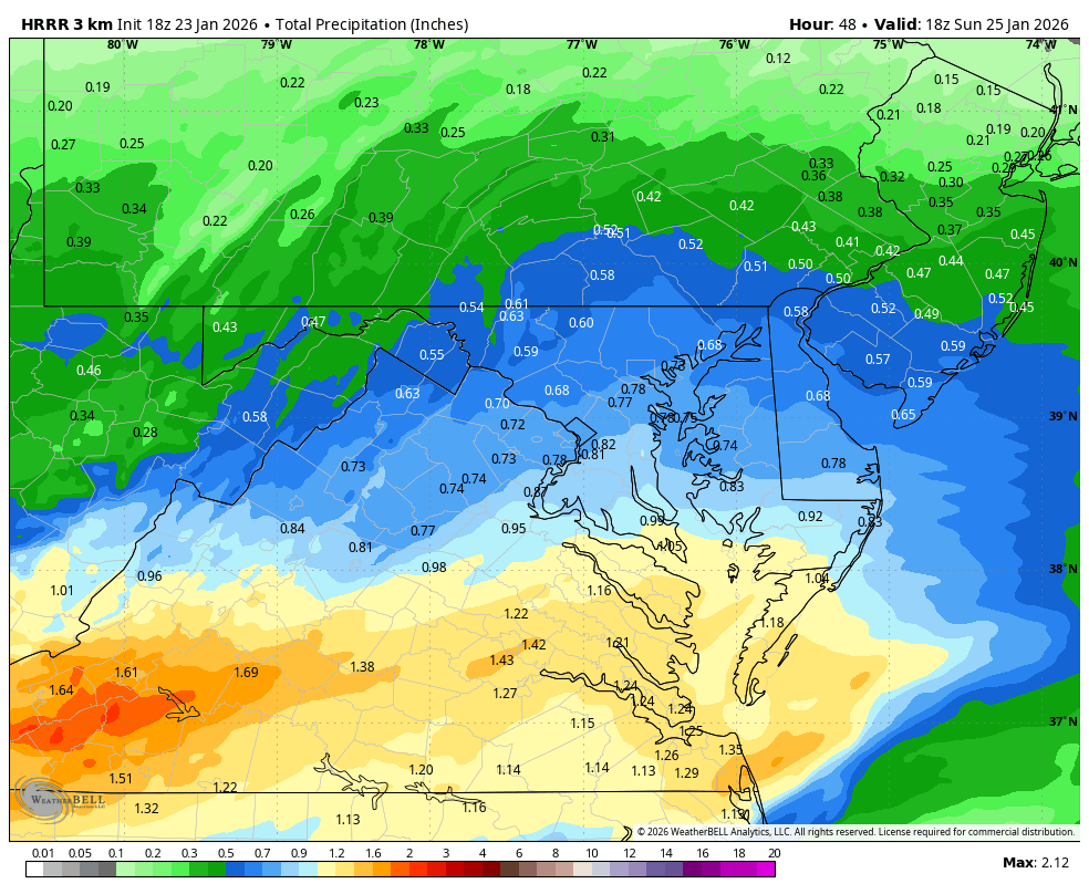 Lord help us all for looking at the HRRR at range, but it is a good 0.70" QPF before the flip in DC. Nice run. -