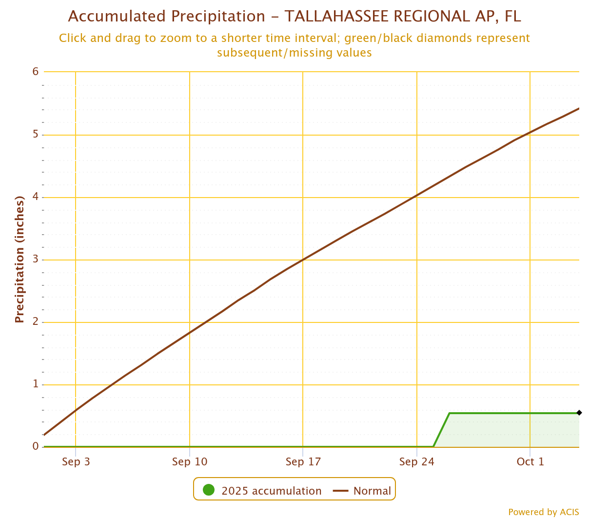I know this sub-forum is mostly made up of North Carolina folk, but living in Tallahassee it's the closest I've got. We're currently under a severe drought after the 3rd driest September on record at TLH. Only ~0.5" of rain fell in September, which came at the end of the month on one day from one thunderstorm. There isn't any drenching rainfall expected in the next week or so, though scattered rainfall chances at least increase with a bit more southerly flow this weekend and early next week. Heading into our "dry" season, it could be an early start to the wildfire season as well. We might need a tropical system to really make a dent in the drought here across the Florida Panhandle, only at 10-20% of our normal rainfall in the past 30 days.