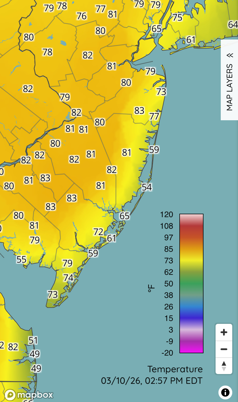 NYC is 79 now but the winds are starting to go more south now.