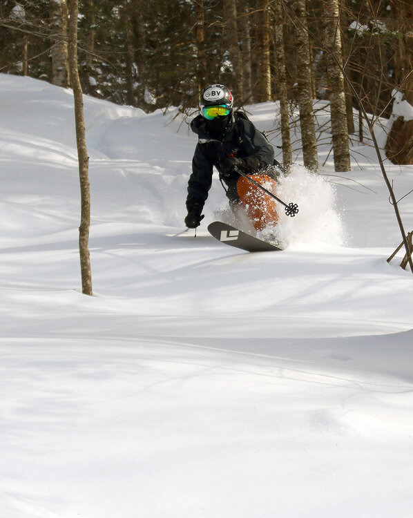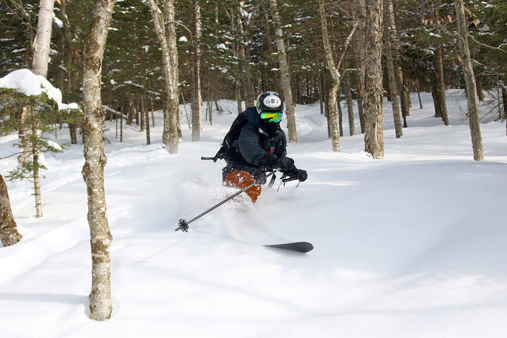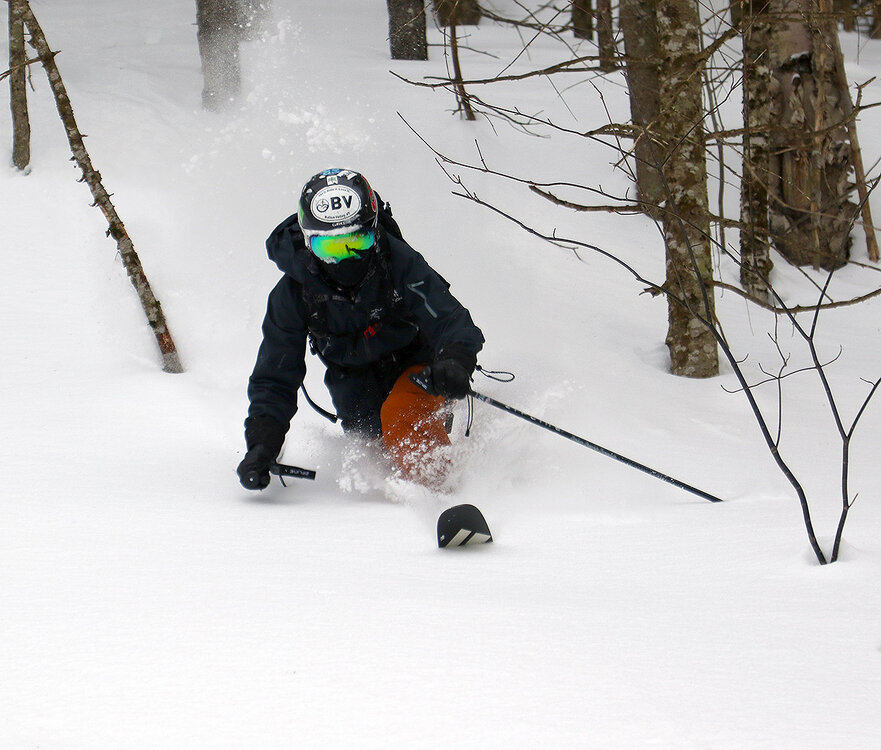 Yesterday my older son and I headed back up to Bolton Valley for another ski session. The powder is still staying in excellent condition, but with another day of holiday weekend skier traffic at the resort, we switched it up from our sidecountry excursions on Sunday to get further into the backcountry on the Bolton Valley Nordic & Backcountry Network. Temperatures were pleasantly seasonable again, but it was cloudy when we arrived in the mid- to late-morning period, and the number of visitors to the resort was much less than what we’d encountered on Sunday. We planned a relatively short tour up the Bryant Trail and then around the Bryant Cabin, but we ended up extending it a bit with a traverse up into the terrain between Heavenly Highway and North Slope. We descended through some fun new terrain down to North Slope, then followed some of the usual glades like Gun Sight through Gotham City and eventually down into some of the lower glades like Cup Runneth Over. We made a brief second lap to hit another glade off World Cup that we’d seen, and that trip helped clarify our understanding of some of those numerous Bryant Trail/World Cup intersections. By the time we were heading out in the mid-afternoon period, the sun was breaking through the clouds and temperatures were creeping up close to the freezing mark in the Village. We didn’t detect any issues with temperatures affecting the quality of the powder at that point, but I wouldn’t be surprised if south-facing lower-elevation areas ultimately saw a bit of thickening in the snow consistency.