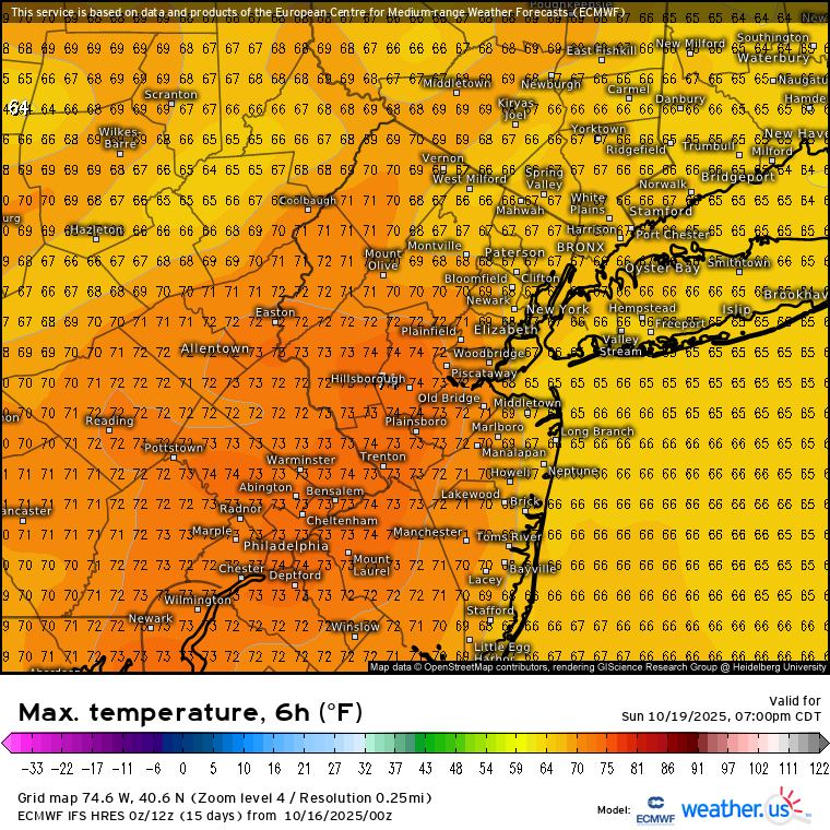Yeah, JFK and several spots in NJ and Eastern PA made it to 70° on the offshore flow. Looks like areas in NJ will be favored for more 70s this weekend. But probably too much onshore flow at places like JFK. Data for October 15, 2025 through October 15, 2025 Click column heading to sort ascending, click again to sort descending. DE WILMINGTON AIRPORT WBAN 73 DE GEORGETOWN-DELAWARE COASTAL AIRPORT WBAN 72 PA PHILADELPHIA INTL AP WBAN 72 NJ ATLANTIC CITY INTL AP WBAN 72 NJ MILLVILLE MUNICIPAL AIRPORT WBAN 71 NJ SOUTH JERSEY REGIONAL AIRPORT WBAN 70 NJ SOMERSET AIRPORT WBAN 70 Data for October 15, 2025 through October 15, 2025 Click column heading to sort ascending, click again to sort descending. NJ NEWARK LIBERTY INTL AP WBAN 72 NJ TETERBORO AIRPORT WBAN 70 NY JFK INTERNATIONAL AIRPORT WBAN 70