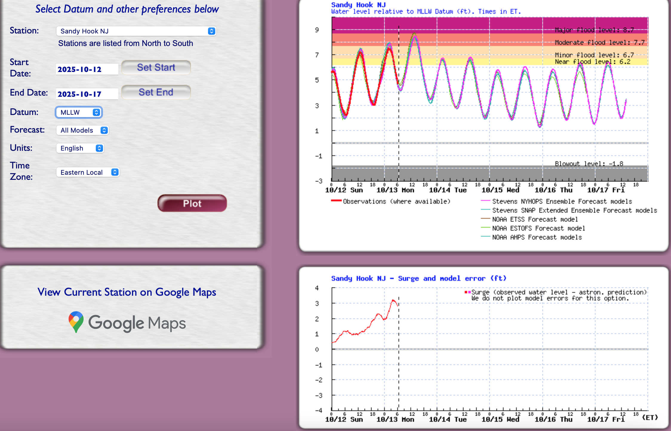Added the most likely scenario for the afternoon high tide, SANDY HOOK representing the onshore packed in water. Rainfall runoff and backed up streams that empty into the Atlantic will exacerbate the flooding this afternoon. So far, no official storm reports that I can see from OKX.