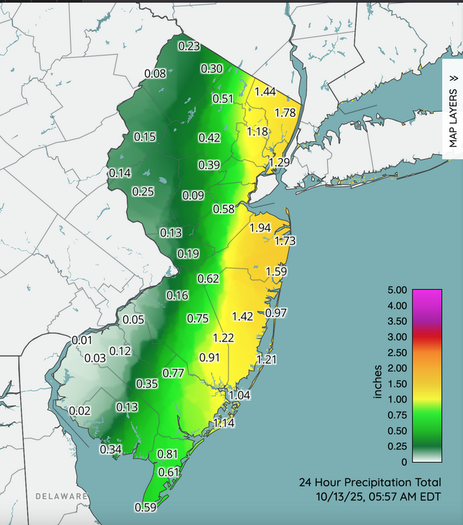 Very moderate event as the system split into two weaker lows instead of one strong consolidated one. Generally 1 to 1.5 for my area. While we have had much heavier rains with October Nor'easters in the past, I will take it since we need the rains.