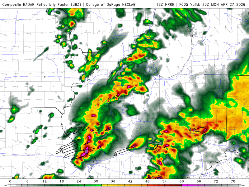Based on current observations, the northern extent of true surfaced-based severe weather should extend roughly on a line from St Louis east/northeast ward. HRRR has the southern portion lit up with discrete cells before going linear.