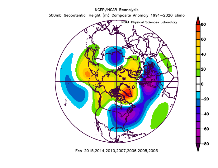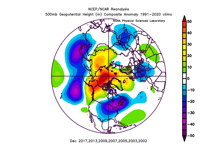 Below are the mean h5 anomalies for all the above normal snowfall months at BWI since 2000. What our ideal "snowy" pattern looks like changes a bit through the season. In December the pacific is much more important, with the most important anomalies being the EPO and AO regions. Later in winter the NAO anomalies are more strongly correlated with snowfall. Across the board the AO remains the most consistent predictor of snowfall probabilities. December January February