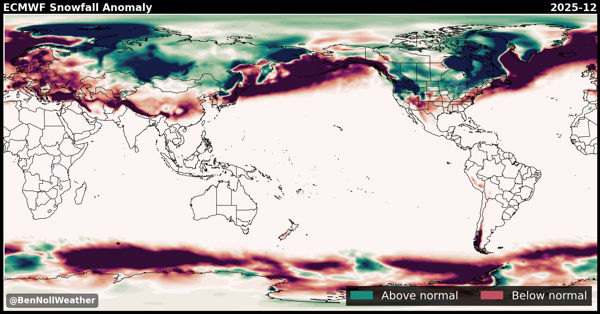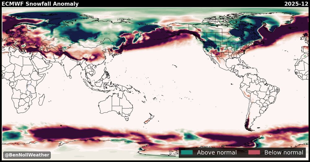 I've seen that long range snowfall monthly/seasonal anomaly map look like that a lot. And in reality over the last 20 years it has looked like that...look at some of the snowfall anomaly plots for this century. I think some of that is probably just the model reflecting the changes due to warming, and the fact that the "averages" it's using to calculate what is "normal" snowfall are lagging due to the warming. Look where the low and high anomalies are around the entire hemisphere. Higher anomalies to the north, lower along the south...what you would expect if climate zones were shifting north (which they are) in the means.