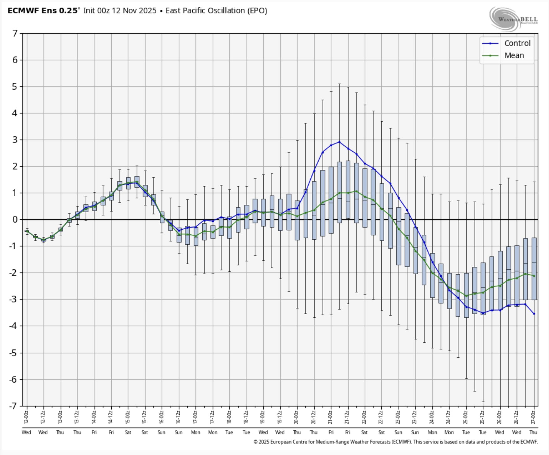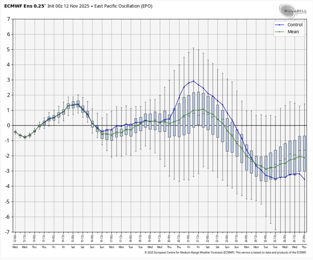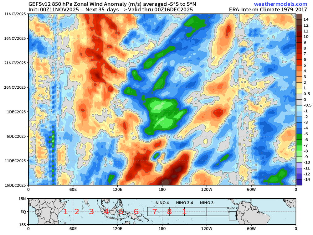Yeah, that will be interesting to watch evolve. Extended range EPS and GEFS are advertising this WWB to push out to the dateline. Which has proven difficult to do in other recent La Niña years. So I'm curious to see how this one goes as we move into December.